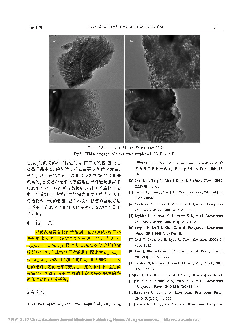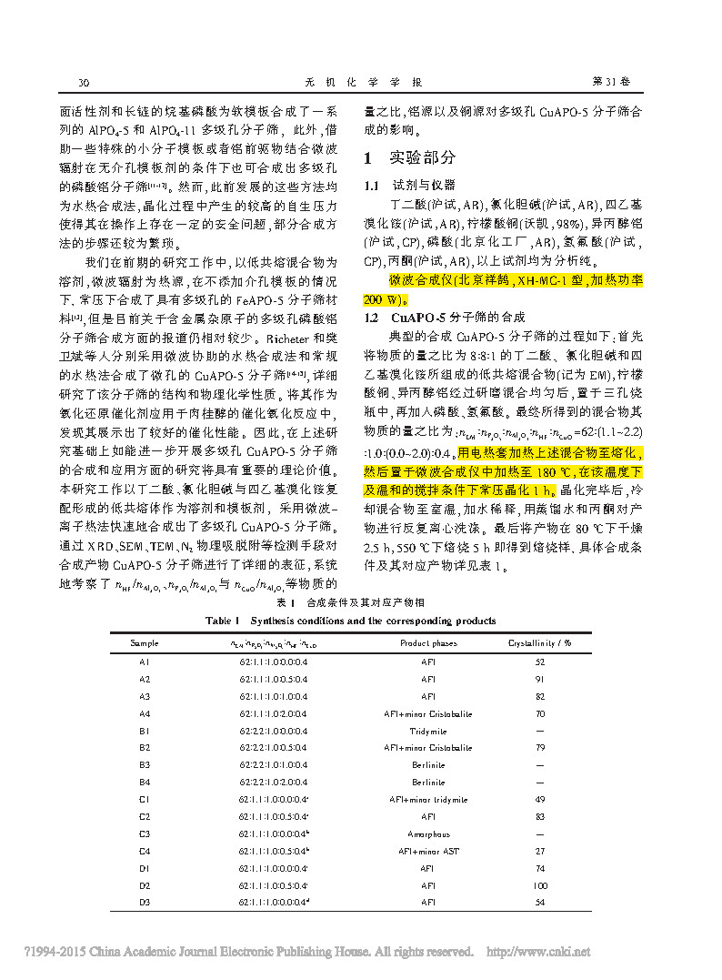 The multi-stage pore CuAPO-5 molecular sieve was synthesized by microwave-ion thermal method using a eutectic mixture as a solvent. Under this system, nP 2O5/nAl2O3, nHF /nAl2O3 and aluminum source have great influence on the synthesis of CuAPO-5 molecular sieve. The optimal ratio of synthesis of this molecular sieve is nEM:nAl2O3:nP 2O5:nHF:nCuO =62:1 : 1.1: (0~2.0): 0.4, aluminum isopropoxide is the most suitable aluminum source. The characterization results show that under certain conditions, the multi-stage pore CuAPO-5 molecular sieve with hexagonal nanodisk shape can be obtained by microwave irradiation.
