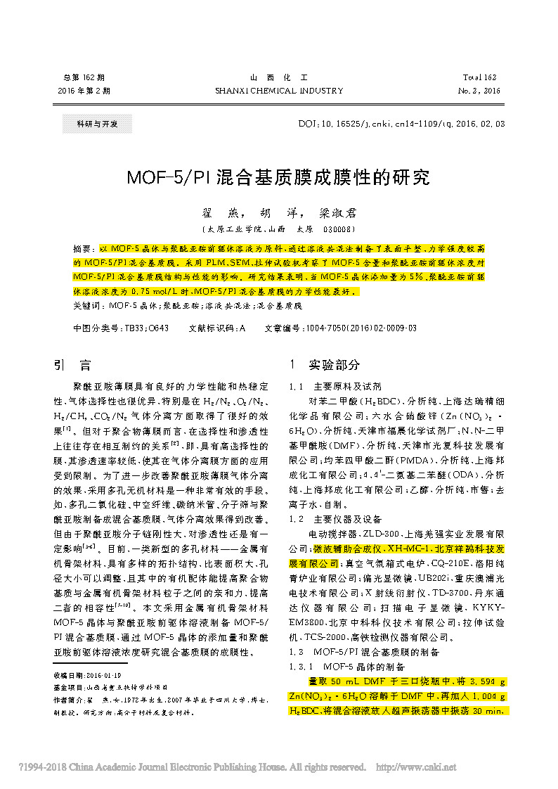 This paper, which was completed by a research scholar at Taiyuan Institute of Technology, discusses papers on the film formation of MOF-5/PI mixed matrix membranes and is published in the important journal .