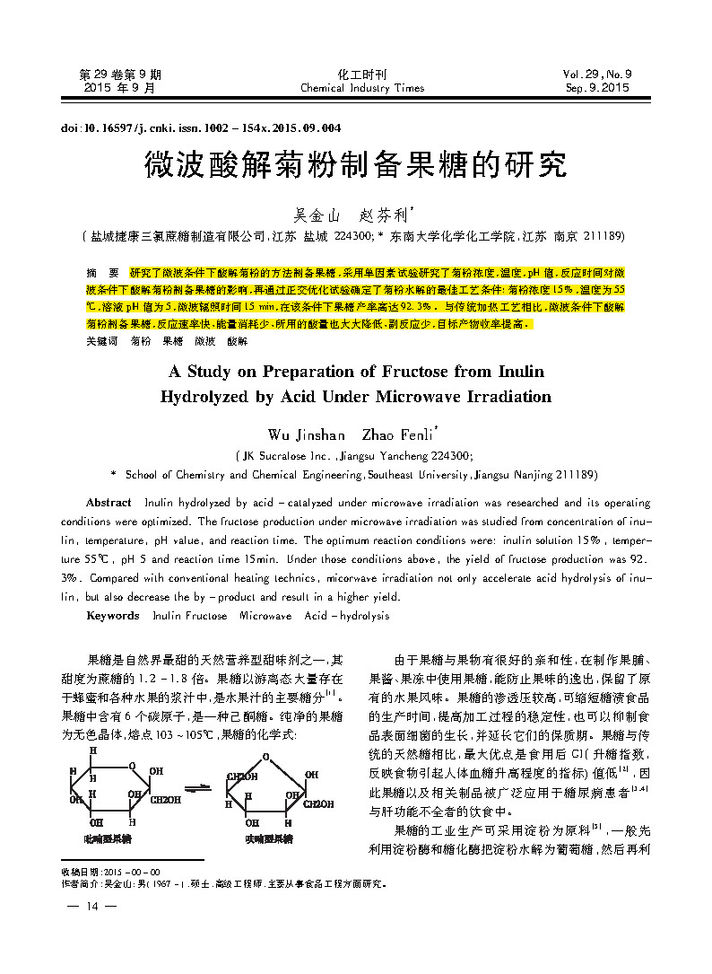 This research by Yancheng Jiekang Sucralose Manufacturing Co., Ltd., a paper on the study of fructose in the preparation of fructose in microwave acidolysis, was published in the important journal .