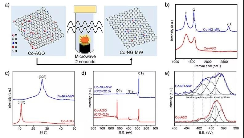 研究人員首先將金屬鹽與氨基化氧化石墨烯溶液進(jìn)行混合,利用金屬離子與氨基之間的強(qiáng)相互作用力,將金屬離子均勻分布于氧化石墨烯片層表面,然后將經(jīng)干燥處理后的混合物置于家用微波爐中,在1000 W下加熱2 s;在微波加熱過程中,石墨烯吸收微波而被激發(fā),瞬間產(chǎn)生高溫,以一步法同時(shí)實(shí)現(xiàn)石墨烯的還原、氮元素的摻雜以及金屬原子在石墨烯晶格中的嵌入。