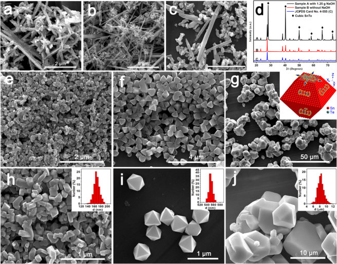 圖二: (a)、(b)和(c)是用0g,1.0g,1.25g NaOH合成的SnTe NPs的SEM圖像; (d)是樣品(a)和(c)的XRD圖譜; (e)和(h),(f)和(i),(g)和(j)是用1.50g,2.50g,5.50g NaOH合成的SnTe粒子的SEM圖像。