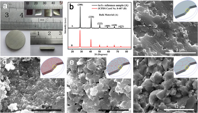 圖三: (a)SPS后樣品的整體形貌,其嵌體分別為矩形柱和方形晶片,用于測(cè)試熱電性能和霍爾測(cè)量: (b)為未摻雜SnTe參考樣品的XRD圖譜; (c)、(d)、(e)和(f)是從機(jī)械合金化粉末(c)或不同直徑的顆粒(165 nm(d)、550 nm(e)和8.2 mm(f)燒結(jié)的致密試樣上的詳細(xì)掃描電鏡圖像。