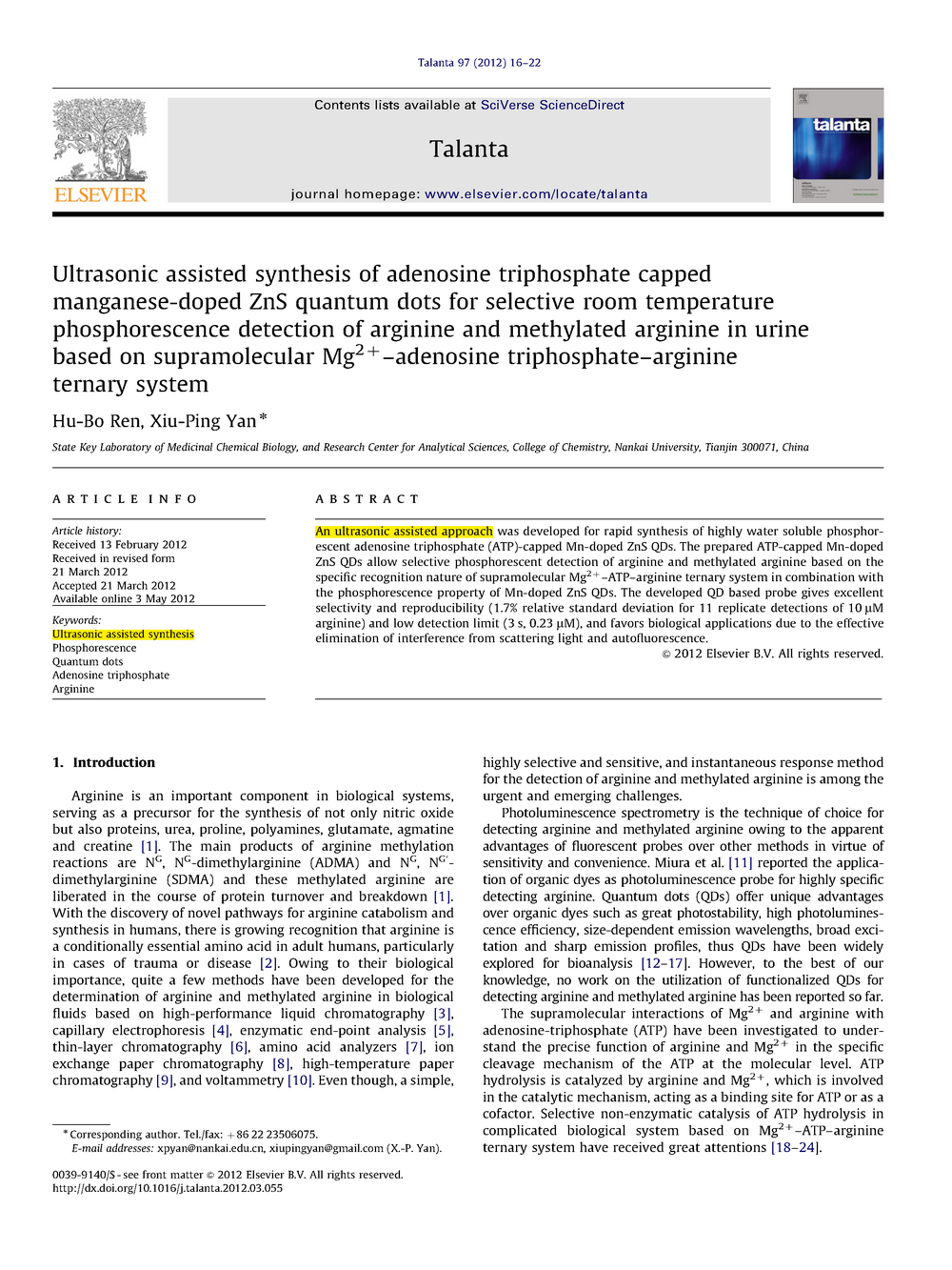 根據(jù)Mg2-ATP-精氨酸三元體系的特殊識(shí)別性質(zhì),結(jié)合Mn摻雜ZnS量子點(diǎn)的磷光性質(zhì),本文討論了一種用于選擇性檢測(cè)精氨酸和甲基化精氨酸的ATP帽摻雜ZnS量子點(diǎn)的超聲輔助合成。該探針選擇性好,重現(xiàn)性好,檢出限低。由于有效地消除了散射光和自熒光的干擾,研制的磷光探針有利于生物應(yīng)用。