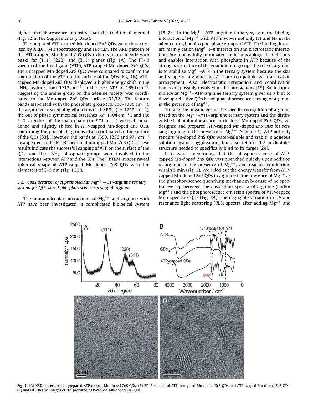 一種快速合成高水溶性磷酸三磷酸腺苷(ATP)冠狀Mn摻雜ZnS量子點(diǎn)的超聲輔助合成方法。制備的ATP冠狀Mn摻雜ZnS量子點(diǎn),結(jié)合Mn摻雜ZnS量子點(diǎn)的磷光特性,根據(jù)Mg2-ATP-精氨酸超分子體系的特殊識(shí)別性質(zhì),實(shí)現(xiàn)了精氨酸和甲基精氨酸的選擇性磷光檢測(cè)。