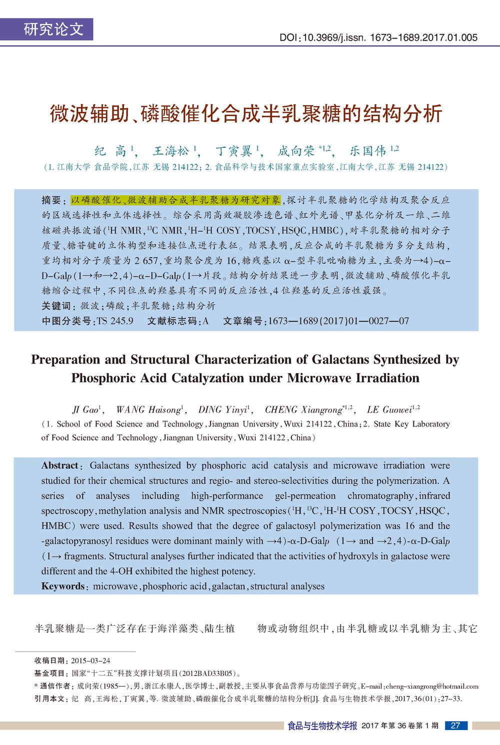 這篇由江南大學(xué)食品學(xué)院的研究學(xué)者完成,討論微波輔助、磷酸催化合成半乳聚糖的結(jié)構(gòu)分析的論文,發(fā)表在重要期刊《食品與生物技術(shù)學(xué)報》上。