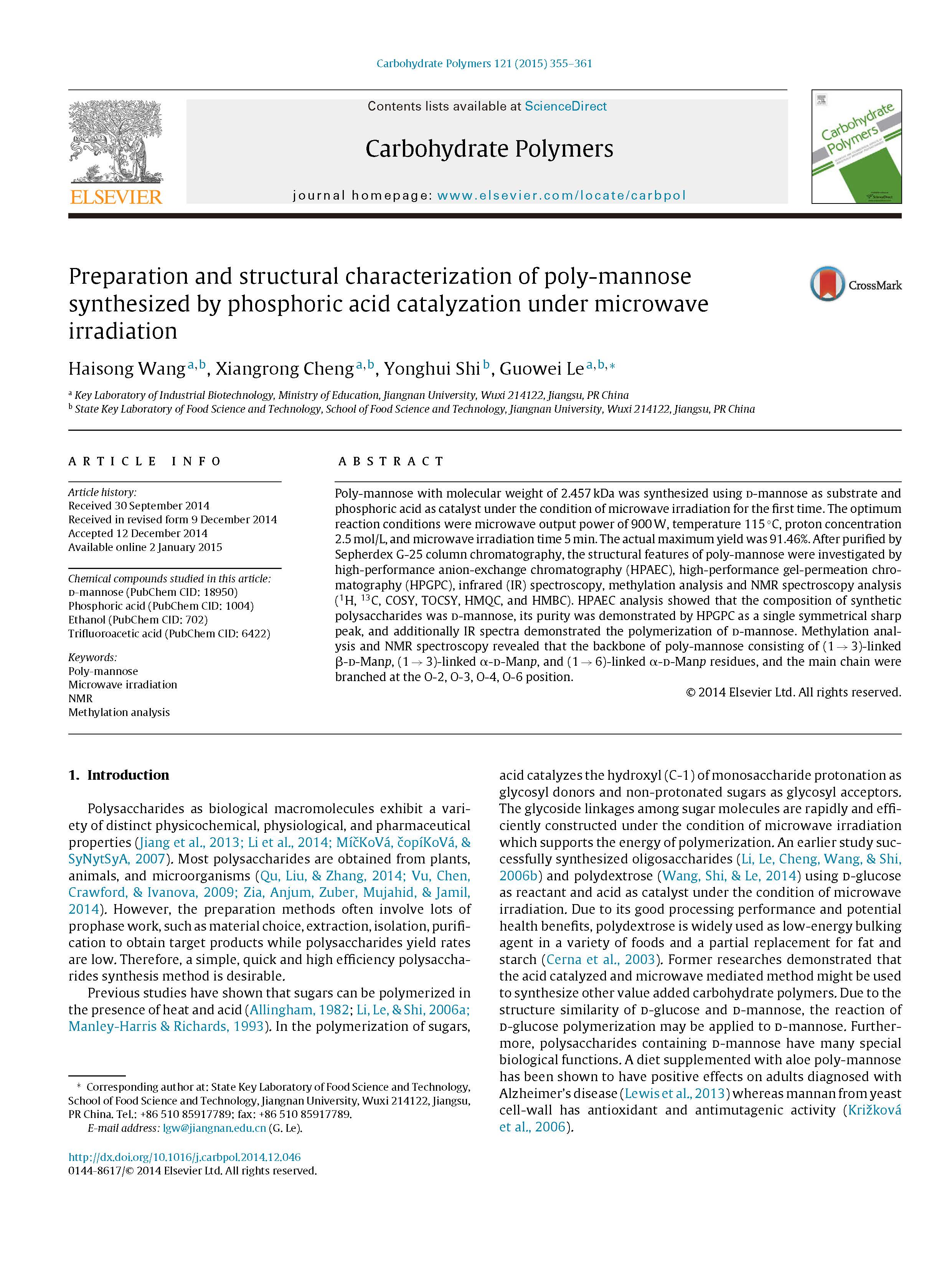 這篇由江南大學(xué)等的研究學(xué)者完成,討論微波輻射下磷酸催化合成聚甘露糖的制備及結(jié)構(gòu)表征的論文,發(fā)表在二區(qū)重要期刊《Carbohydrate Polymers》,影響因子:5.158。