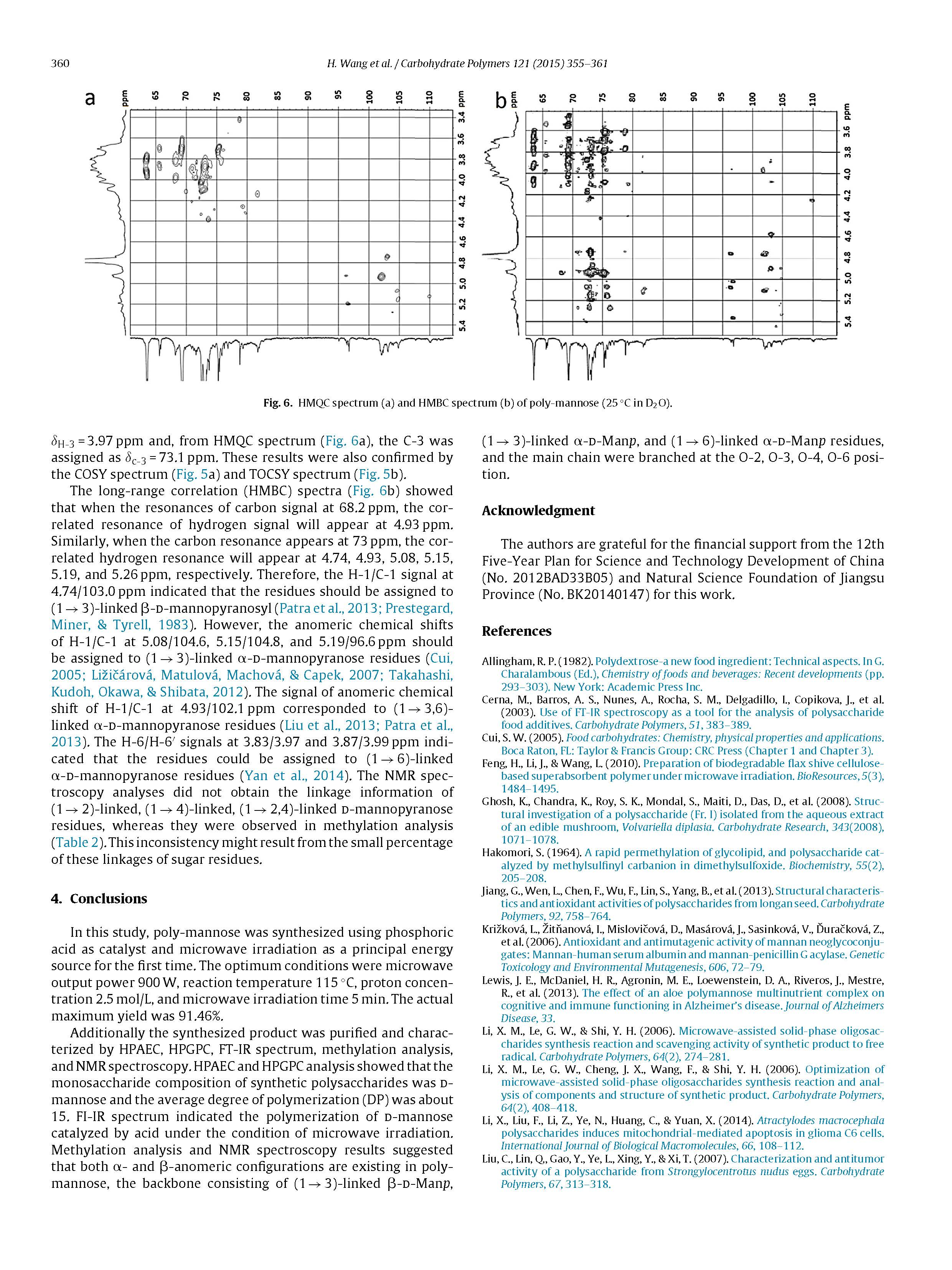 本研究首次以磷酸為催化劑,微波輻射為主要能源,合成了聚甘露糖。最佳工藝條件為微波輸出功率900 W,反應(yīng)溫度115℃,質(zhì)子濃度2.5mol/L,微波輻射時(shí)間5 min。實(shí)際最高收率為91.46%。并通過HPAEC、HPGPC、FT-IR、甲基化分析和NMR等手段對(duì)合成產(chǎn)物進(jìn)行了純化和表征。HPAEC和HPGPC分析表明,合成多糖的單糖組成為甘露糖,平均聚合度(DP)約為15。紅外光譜表明,在微波輻射條件下,酸催化D-甘露糖的聚合.甲基化分析和核磁共振波譜結(jié)果表明,聚甘露糖中均存在-和-異常結(jié)構(gòu),主鏈由(1→3)-d-MANP,(1→3)-連接,-d-MANP和(1→6)-d-Manp殘基組成,主鏈在O-2上支化,O-3,O-4,O-6位置。