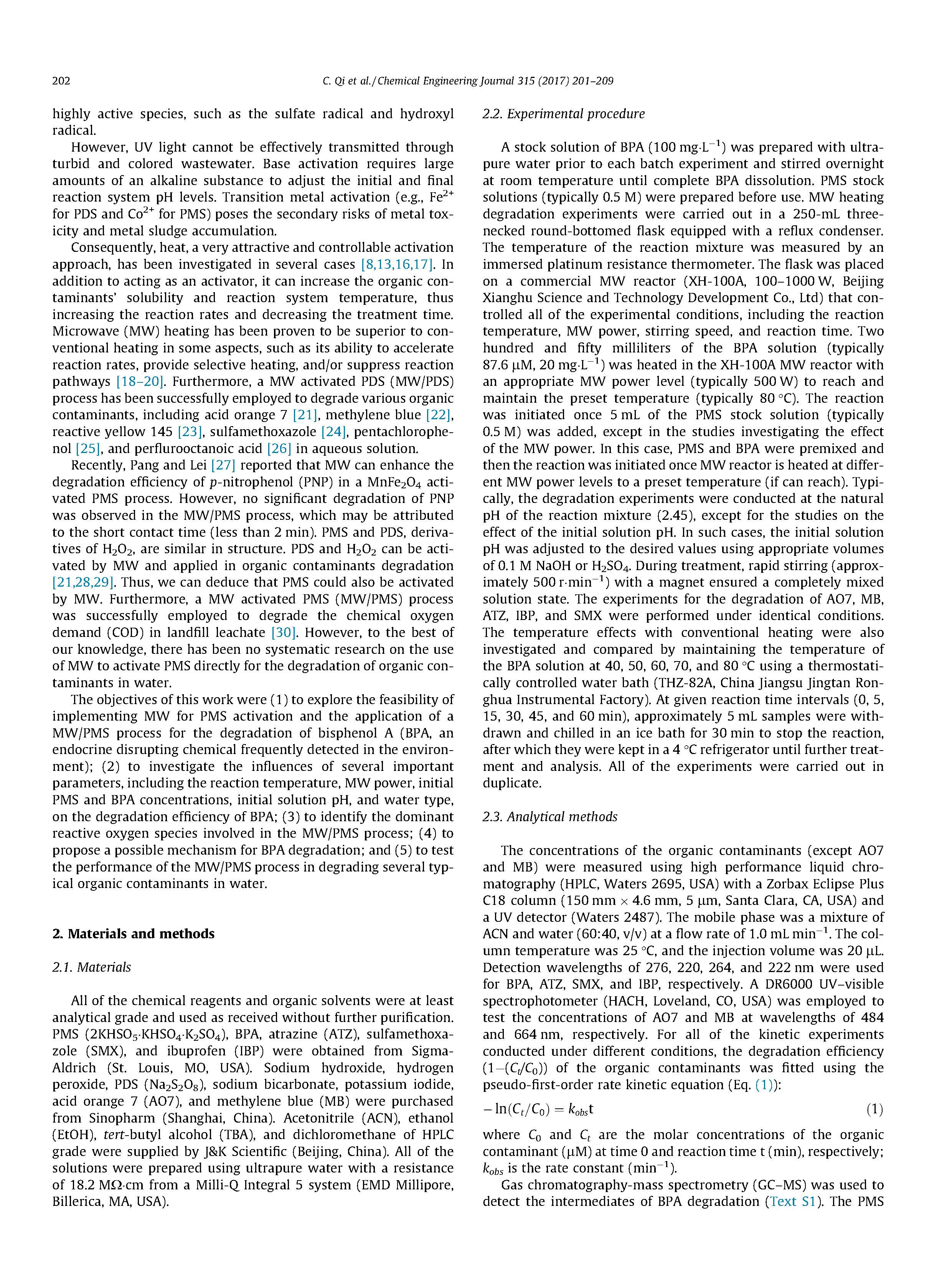 每批實驗前用超純水制備BPA(100 MGL-1)原液,室溫攪拌至BPA完全溶解。PMS庫存溶液(通常為0.5M)是在使用前編寫的。在250-mL裝有回流冷凝器的圓形底瓶中進行了微波加熱降解實驗。用浸鉑電阻溫度計測量了反應混合物的溫度。將該燒瓶放置在某工業(yè)MW堆(XH-100A,100-1000 W,北京祥鵠科技開發(fā)有限公司)上,控制了反應溫度、功率、攪拌速度和反應時間等實驗條件。250毫升的BPA溶液(通常為87.6毫升,20毫升,1毫升)在XH-100A兆瓦反應堆中加熱,并具有適當?shù)恼淄吖β仕?通常為500 W),以達到并維持預定的溫度(通常為80兆瓦)。c)該反應是在PMS原液(一般為0.5M)加入5mL后才開始的,但在研究兆瓦功率的影響時除外。在這種情況下,PMS和BPA是預混的,然后當MW堆在不同的功率水平加熱到預定的溫度(如果可以達到)時,就開始了反應。通常,降解實驗是在反應混合物的自然pH值(2.45)下進行的,但對初始溶液pH值影響的研究除外。在這種情況下,使用適當體積的0.1 M NaOH或H2SO4調(diào)節(jié)初始溶液的pH值。在處理過程中,快速攪拌(約500r min-1)與磁鐵確保了一個完全混合的溶液狀態(tài)。在相同的條件下,對AO7、MB、ATZ、IBP和SMX進行了降解實驗。通過將bpa溶液的溫度保持在40、50、60、70和80,考察和比較了常規(guī)加熱對溫度的影響。C采用恒溫控制水浴(太赫茲-82A,中國江蘇景灘榮華器器廠)。在給定的反應時間間隔(0,5,15,30,45和60分鐘),大約5毫升樣品被取出,在冰浴中冷藏30分鐘以停止反應,然后將它們保存在4℃冰箱,直至進一步處理和分析。所有實驗一式兩份進行。