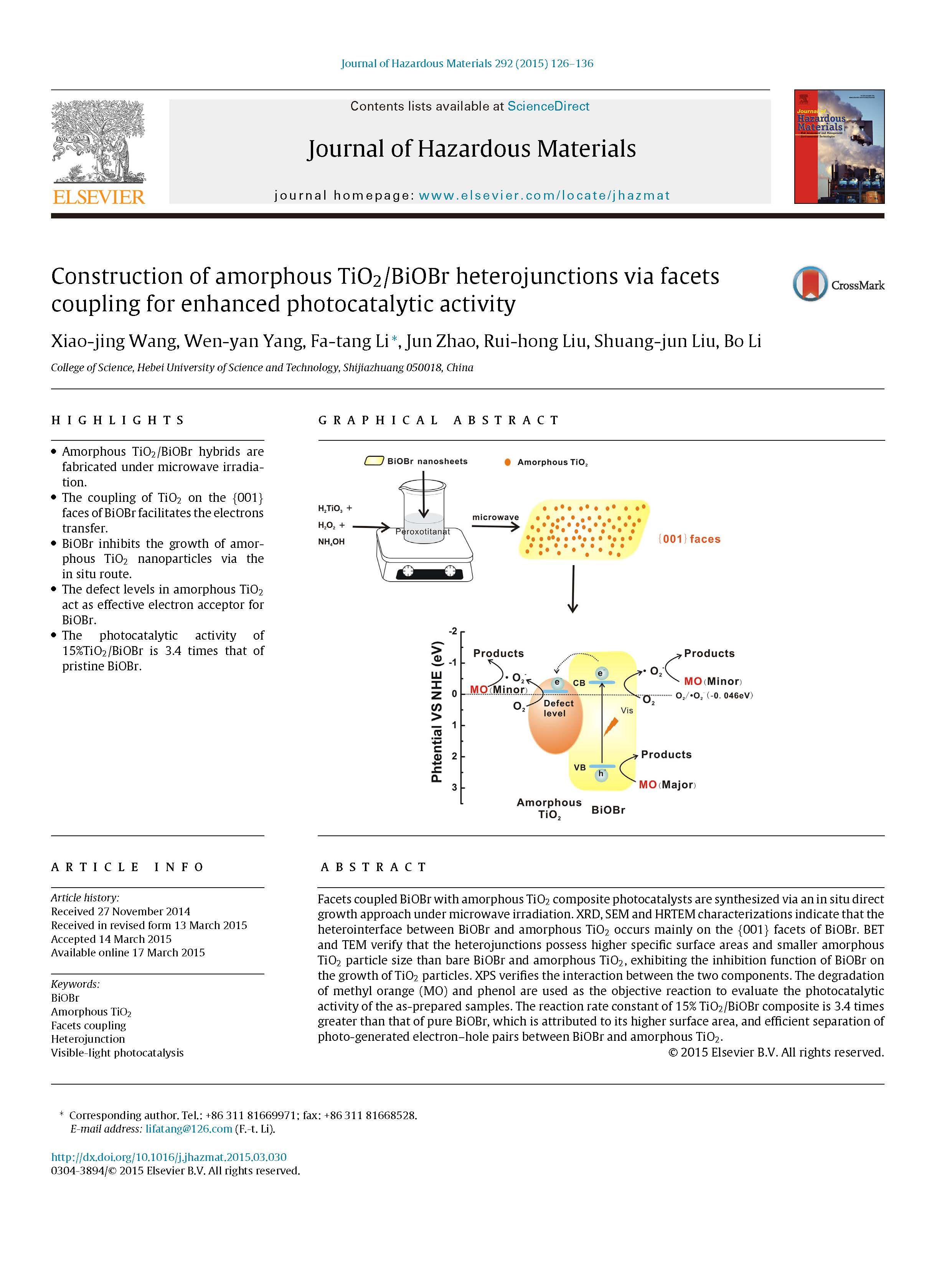 這篇由河北科技大學(xué)理學(xué)院等的研究學(xué)者完成,討論通過(guò)小面耦合構(gòu)造非晶態(tài)TiO2 / BiOBr異質(zhì)結(jié)以提高光催化活性的論文,發(fā)表在一區(qū)重要期刊《Journal of Hazardous Materials》,影響因子:6.434。
