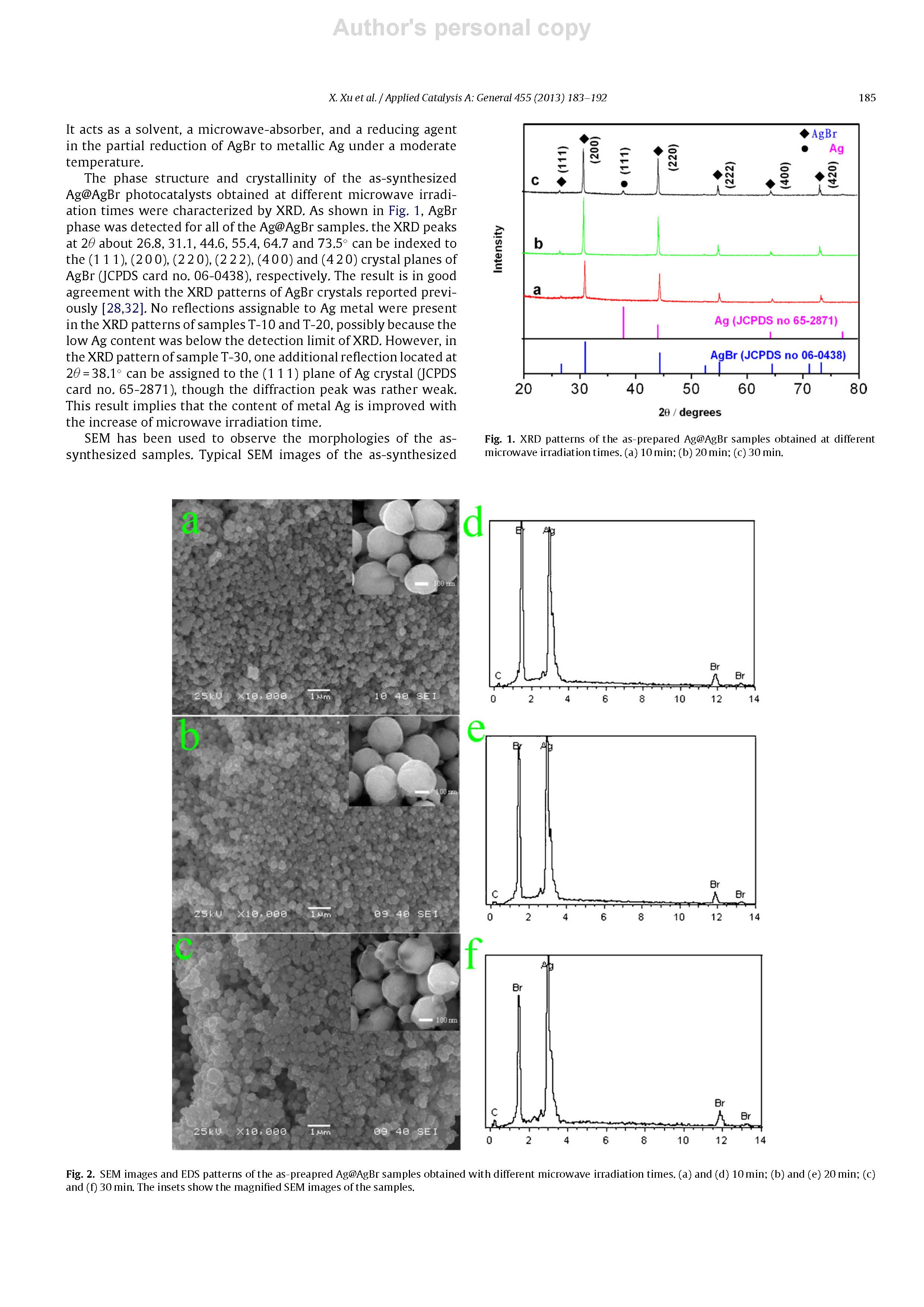 采用一種簡便、快速的微波輔助非水化方法合成了Ag@AgBr光催化劑.在一個典型的過程中,15 mL的EG在冰浴中冷卻到0℃,然后2 mmol的AgNO 3溶解在其中形成一個清晰的溶液。在單獨的燒杯中,在15 mL EG中加入2 mmol NaBr和3 mmol PVP,室溫超聲作用形成均勻溶液,然后在強攪拌下緩慢滴入AgNO 3溶液中30 min。將得到的混合物轉(zhuǎn)移到100 mL的燒瓶中,并將燒瓶放入XH-MC-1微波反應器系統(tǒng)(中國北京祥鵠科技設備有限公司)。用微波加熱至160℃,在溫度下保溫10 min。然后用冰浴將反應體系快速冷卻到室溫。所得產(chǎn)品經(jīng)離心收集,用無水乙醇多次洗滌,然后在45℃真空干燥12h,樣品以T-10表示。在對照實驗中,以T-20和T-30為代表樣品的時間序列分別為20 min和30 min,其它條件相同。