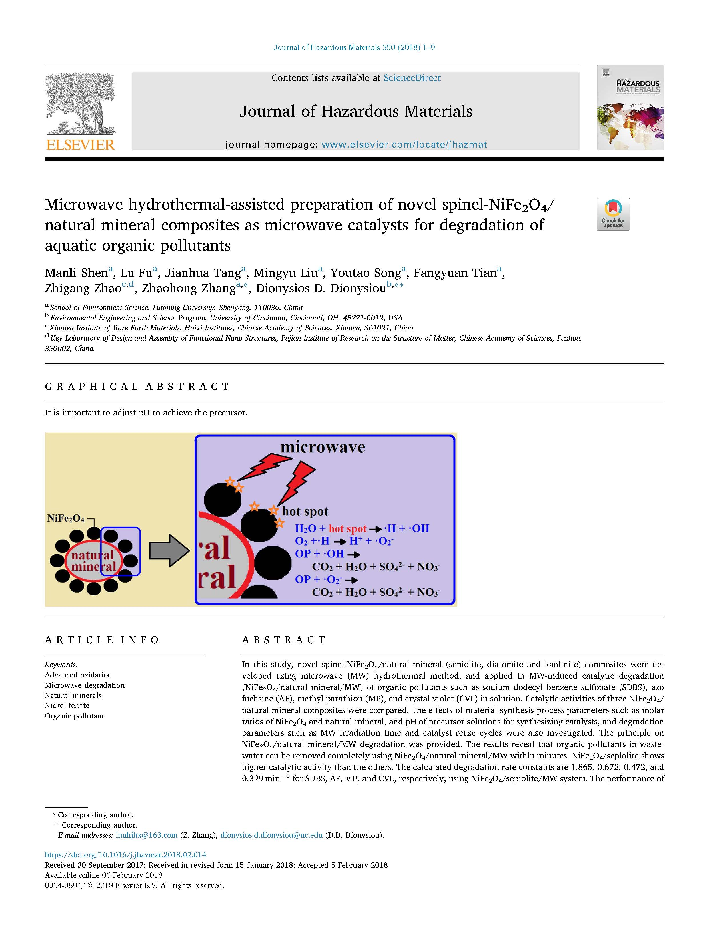 本研究采用微波水熱法制備了尖晶石-NiFe2O4/天然礦物(海泡石、硅藻土和高嶺石)復合材料,并將其應用于十二烷基苯磺酸鈉(SDBs)、偶氮胂(AF)、甲基對硫磷(MP)等有機污染物的微波催化降解(NiFe2O4/天然礦物/mw)中,以及溶液中的結晶紫(CVL)。
