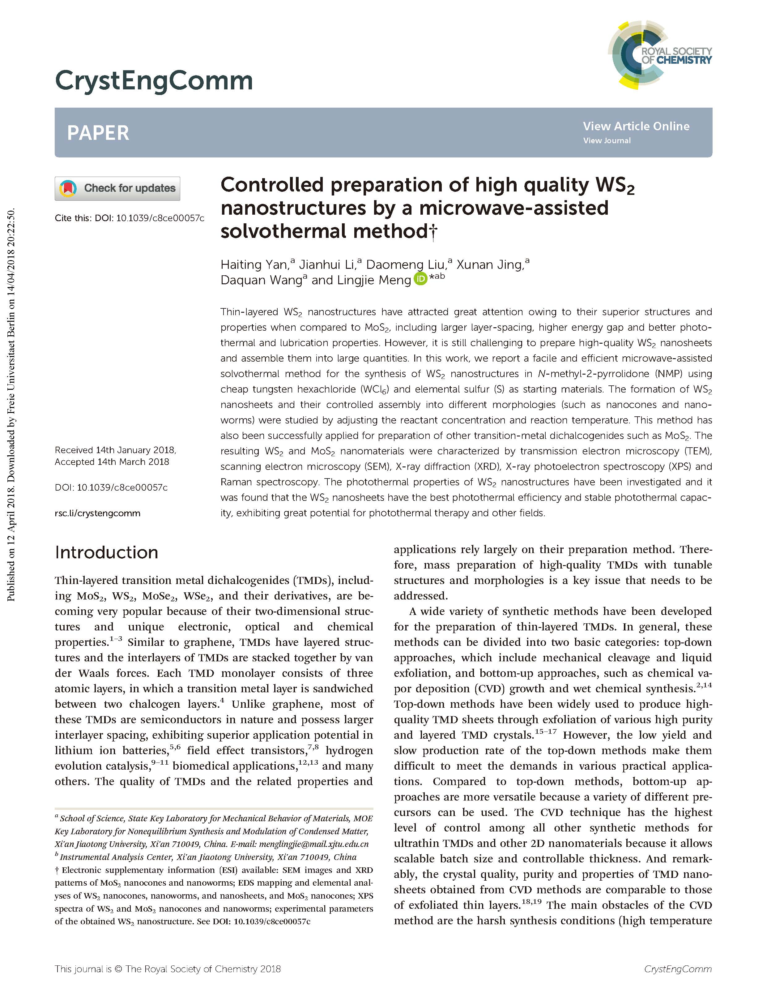 該方法具有:也被成功地應(yīng)用于制備其它過渡金屬Dichalogenides,例如MoS2。所需的得到的WS2和MoS2納米材料的特征在于透射電子顯微鏡(TEM),掃描電子顯微鏡(SEM)、X射線衍射(XRD)、X射線光電子能譜(XPS)和拉曼光譜。研究了WS2納米結(jié)構(gòu)的光熱特性,已發(fā)現(xiàn)WS2納米片具有最佳的光熱效率和穩(wěn)定的光熱能力,對于光熱治療和其它領(lǐng)域具有極大的潛力。