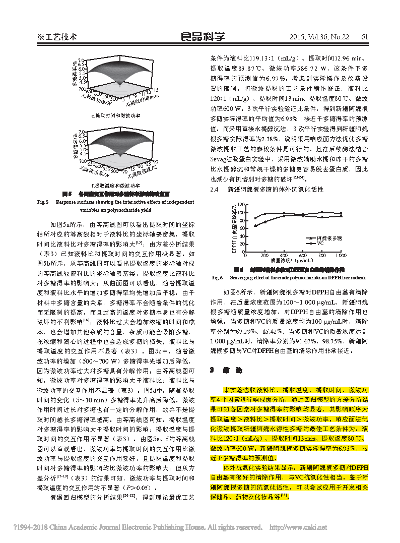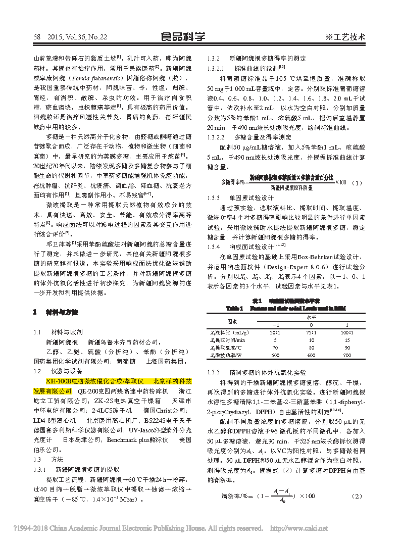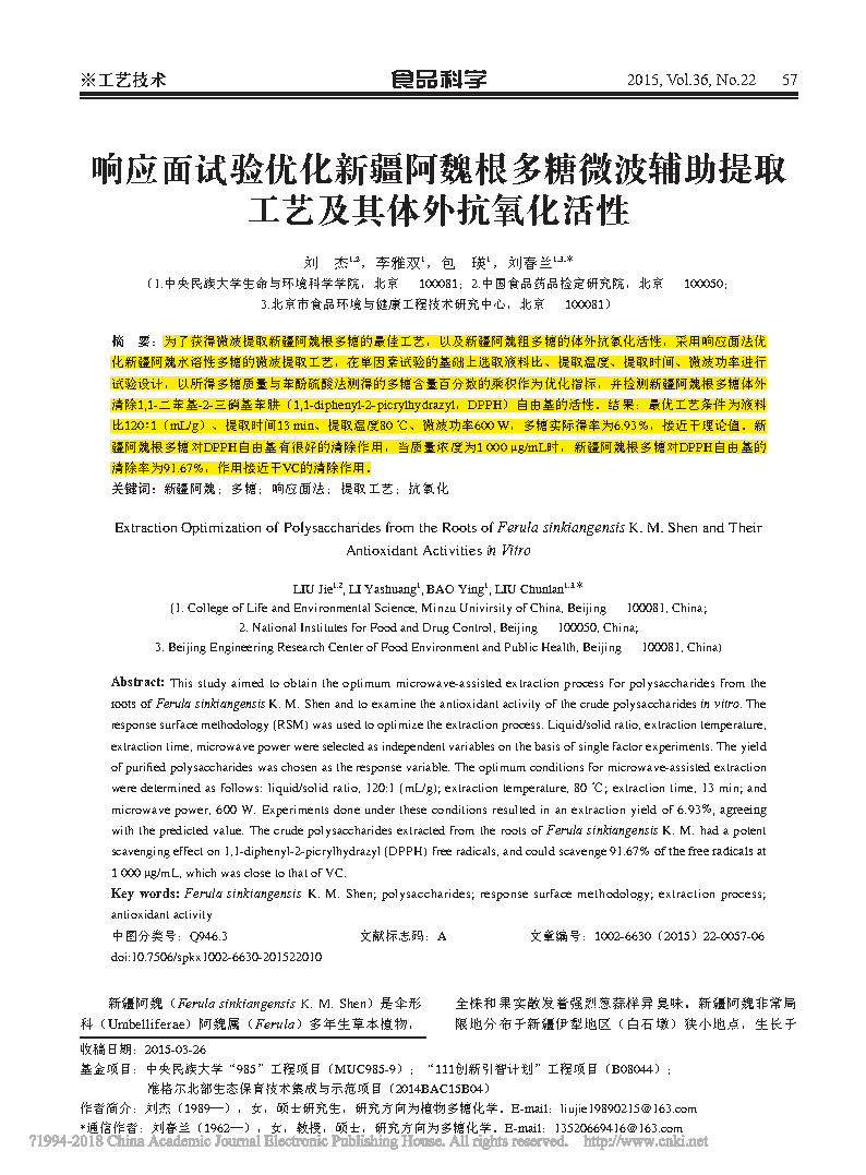 ? 這篇由中央民族大學(xué)生命與環(huán)境科學(xué)學(xué)院的研究學(xué)者完成,討論響應(yīng)面試驗優(yōu)化新疆阿魏根多糖微波輔助提取工藝及其體外抗氧化活性的論文,發(fā)表在重要期刊《食品科學(xué)》上。