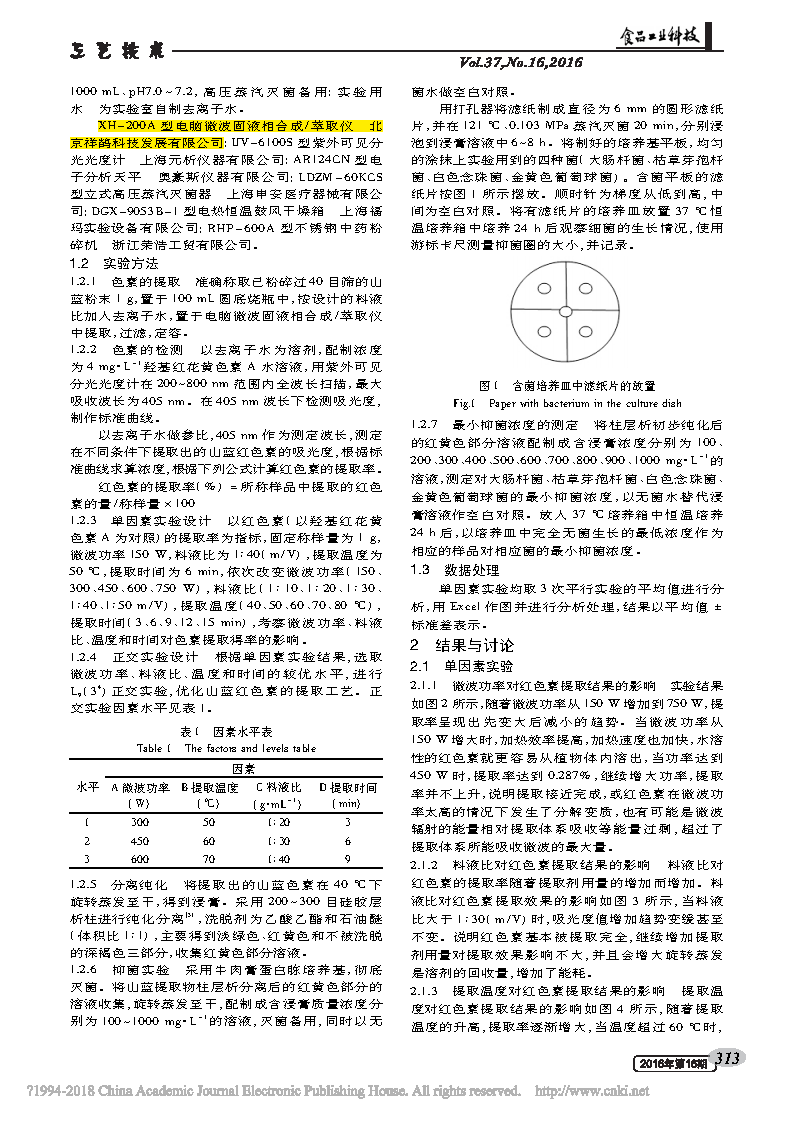 色素的提?。簻?zhǔn)確稱取已粉碎過 40 目篩的山藍(lán)粉末1 g,置于100 mL 圓底燒瓶中,按設(shè)計的料液比加入去離子水,置于電腦微波固液相合成 /萃取儀中提取,過濾,定容。
