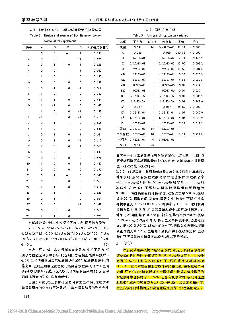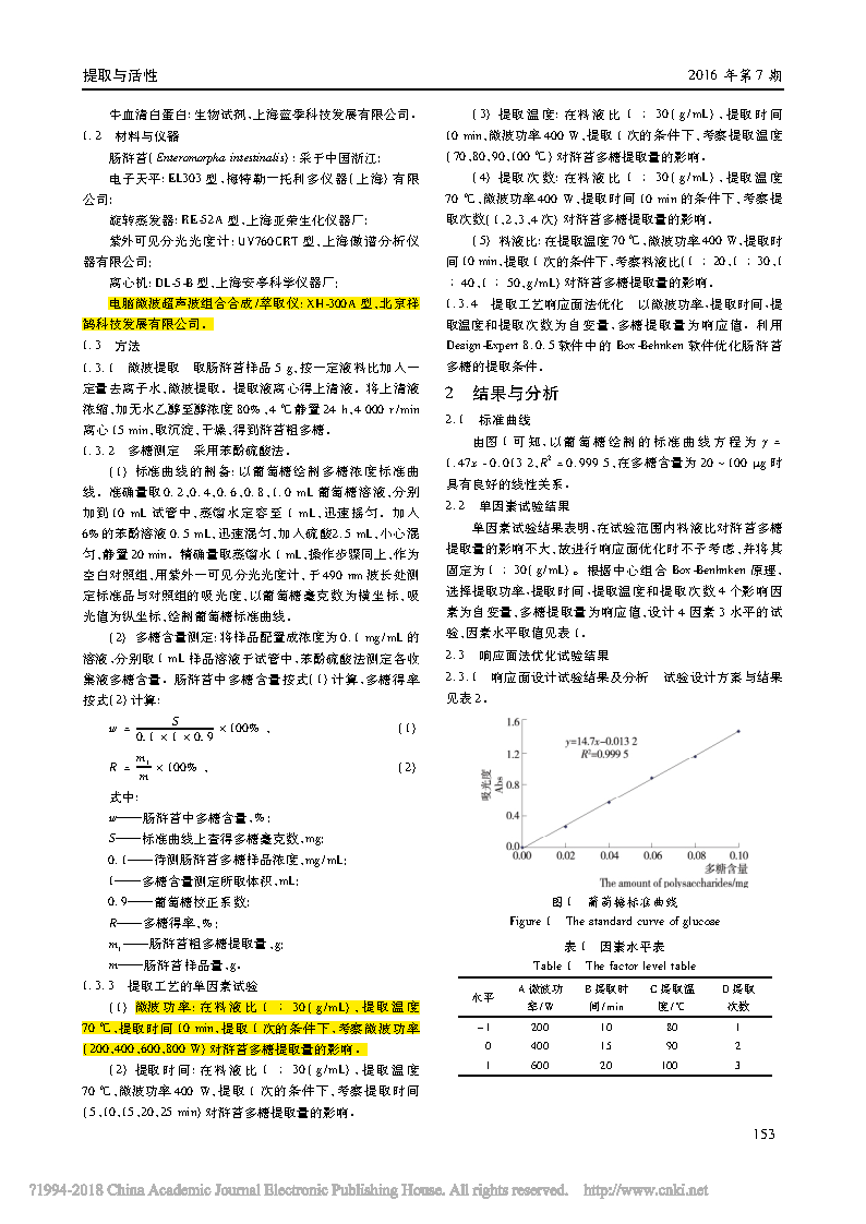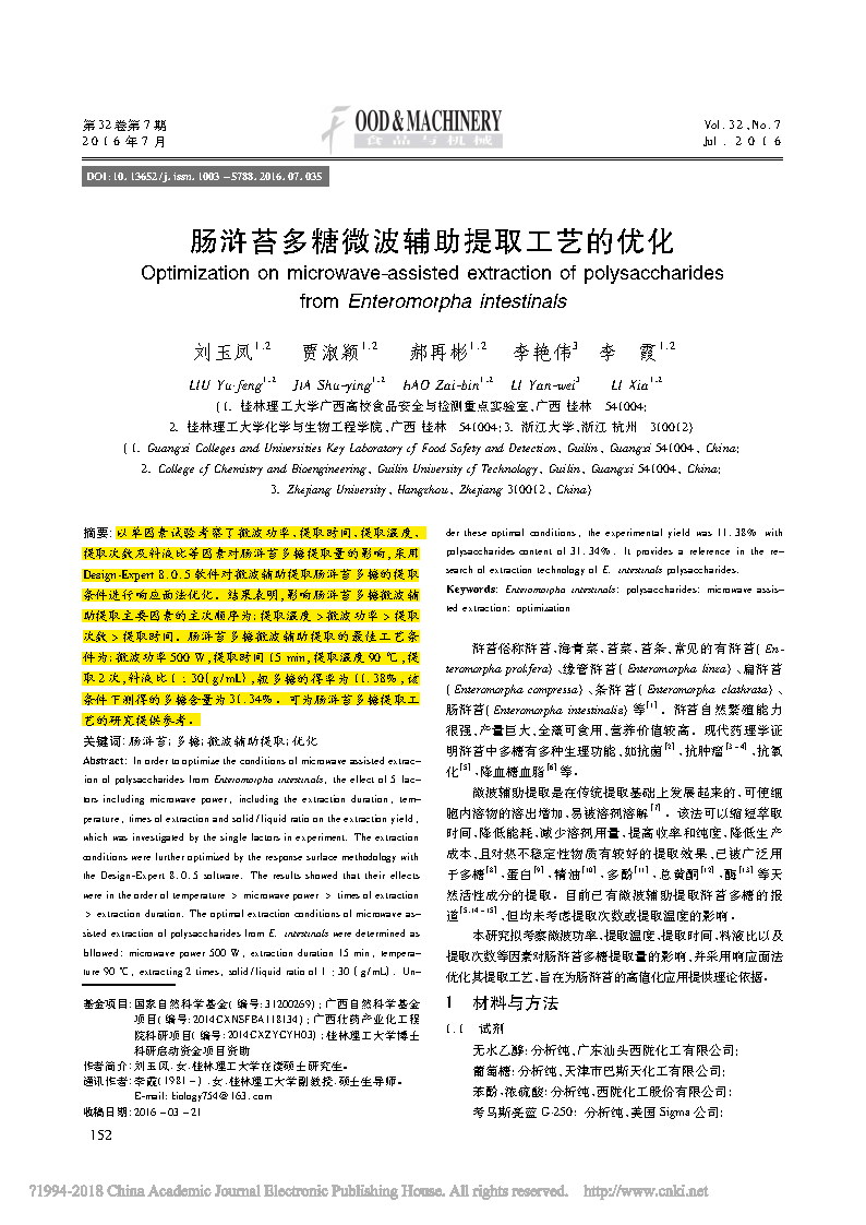 以單因素試驗(yàn)考察了微波功率、提取時(shí)間、提取溫度、提取次數(shù)及料液比等因素對腸滸苔多糖提取量的影響,采用 Design-Expert 8. 0.5 軟件對微波輔助提取腸滸苔多糖的提取 條件進(jìn)行響應(yīng)面法優(yōu)化。結(jié)果表明,影響腸滸苔多糖微波輔助提取主要因素的主次順序?yàn)? 提取溫度 > 微波功率 > 提取 次數(shù) > 提取時(shí)間。腸滸苔多糖微波輔助提取的最佳工藝條件為: 微波功率 500 W,提取時(shí)間 15 min,提取溫度 90 ℃ ,提取 2 次,料液比130( g /mL) ,粗多糖的得率為 11. 38% ,該條件下測得的多糖含量為31. 34% ??蔀槟c滸苔多糖提取工藝的研究提供參考。