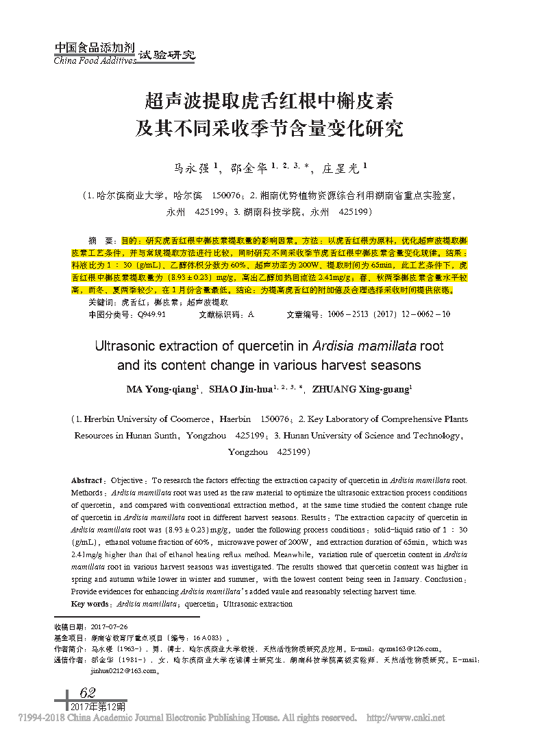 這篇由哈爾濱商業(yè)大學的研究學者完成,討論超聲波提取虎舌紅根中槲皮素及其不同采收季節(jié)含量變化研究的論文,發(fā)表在重要期刊《中國食品添加劑》上。