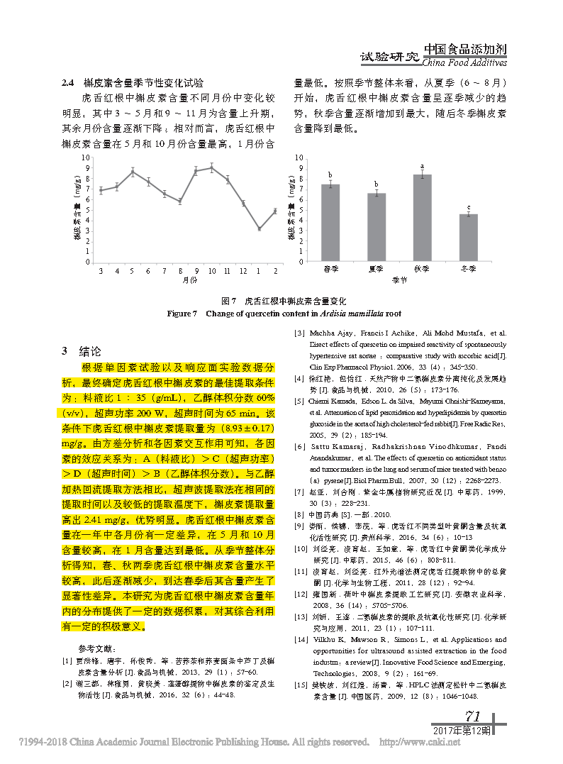 根據(jù)單因素試驗以及響應面實驗數(shù)據(jù)分析,最終確定虎舌紅根中槲皮素的最佳提取條為:料液比 1∶35(g/mL),乙醇體積分數(shù) 60%(v/v),超聲功率200 W,超聲時間為65min。該條件下虎舌紅根中槲皮素提取量為(8.93± 0.17)mg/g。由方差分析和各因素交互作用可知,各因素的效應關系為:A(料液比)> C(超聲功率)> D(超聲時間)> B(乙醇體積分數(shù))。與乙醇加熱回流提取方法相比,超聲波提取法在相同的提取時間以及較低的提取溫度下,槲皮素提取量高出 2.41 mg/g,優(yōu)勢明顯?;⑸嗉t根中槲皮素含量在一年中各月份有一定差異,在 5月和10月含量較高,在 1月含量達到最低。從季節(jié)整體分析得知,春、秋兩季虎舌紅根中槲皮素含量水平較高,此后逐漸減少,到達春季后其含量產(chǎn)生了顯著性差異。本研究為虎舌紅根中槲皮素含量年內(nèi)的分布提供了一定的數(shù)據(jù)積累,對其綜合利用有一定的積極意義。