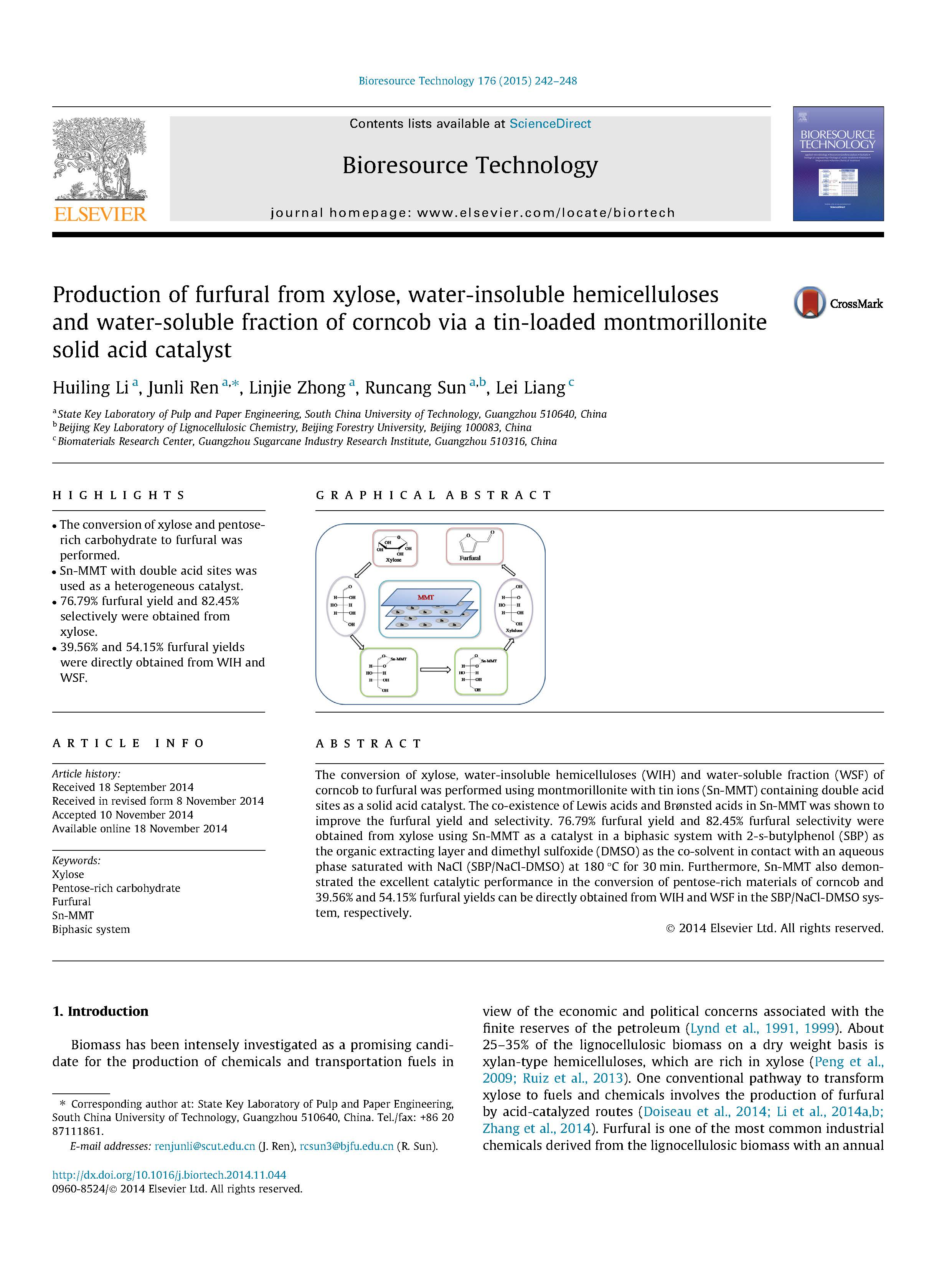 這篇由華南理工大學(xué)等的研究學(xué)者完成,討論通過載錫蒙脫石固體酸催化劑從木糖,水不溶性半纖維素和玉米芯的水溶性部分生產(chǎn)糠醛的論文,發(fā)表在一區(qū)重要期刊《Bioresource Technology》,影響因子:5.807。