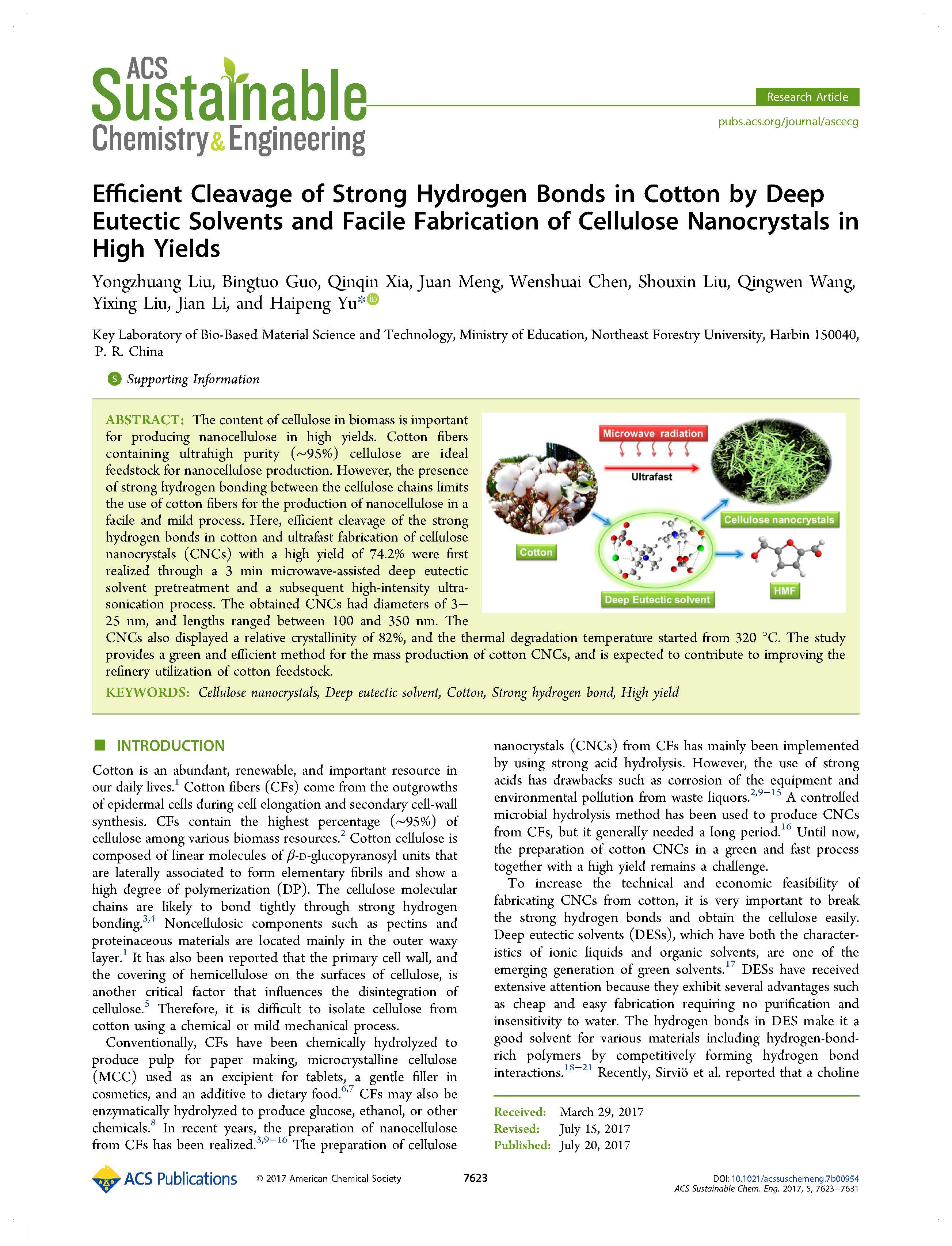 這篇由西安交通大學(xué)等的研究學(xué)者完成,討論通過(guò)深低共熔溶劑高效裂解棉中的強(qiáng)氫鍵并高效地制備纖維素納米晶的論文,發(fā)表在二區(qū)重要期刊《ACS Sustainable Chemistry & Engineering》,影響因子:6.140。