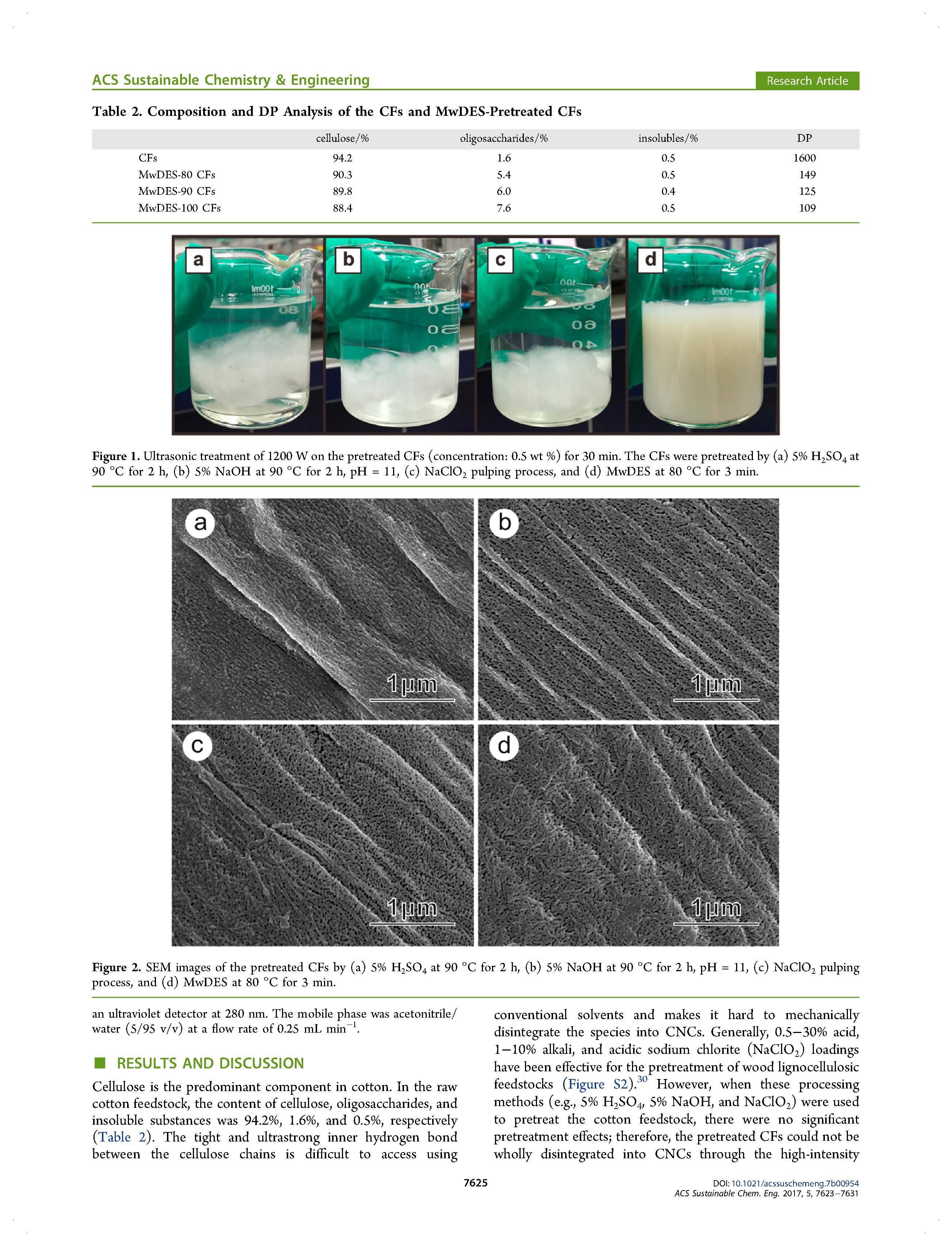 然而,纖維素鏈之間的強(qiáng)氫鍵的存在限制了棉纖維在一個(gè)簡(jiǎn)單而溫和的過(guò)程中生產(chǎn)納米纖維素的使用。通過(guò)微波輔助深共晶溶劑預(yù)處理和后續(xù)的高強(qiáng)度超聲處理,首次實(shí)現(xiàn)了棉花強(qiáng)氫鍵的高效裂解和纖維素納米晶(CNCS)的超高速制備,產(chǎn)率達(dá)74.2%,其直徑為3−25 nm,長(zhǎng)度為10 0~3 5 0nm。
