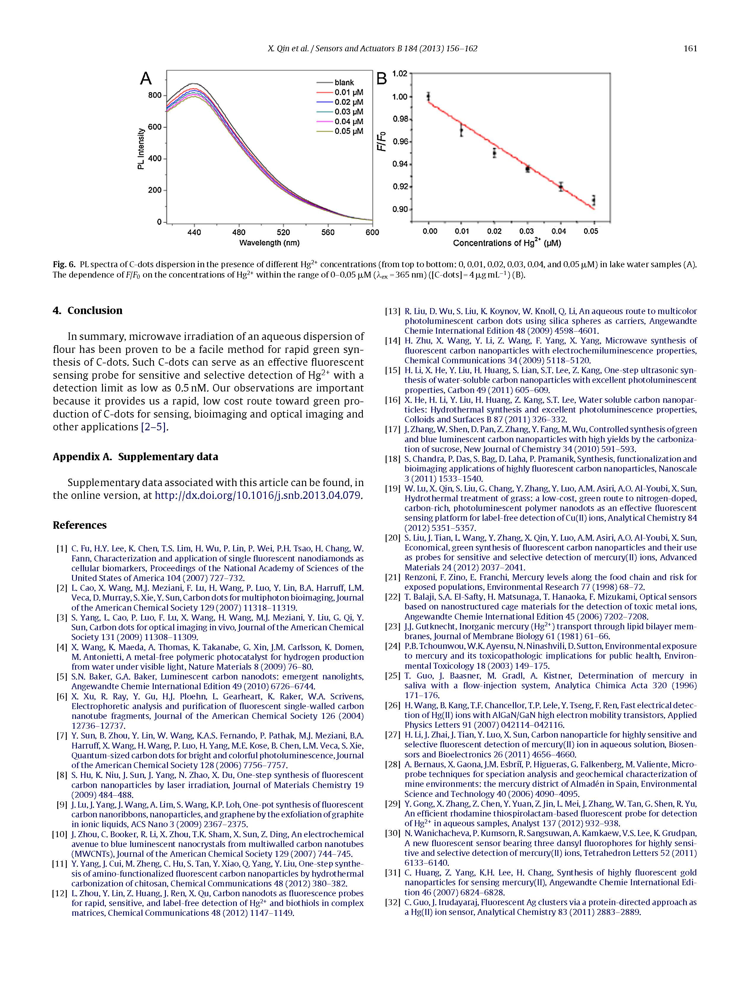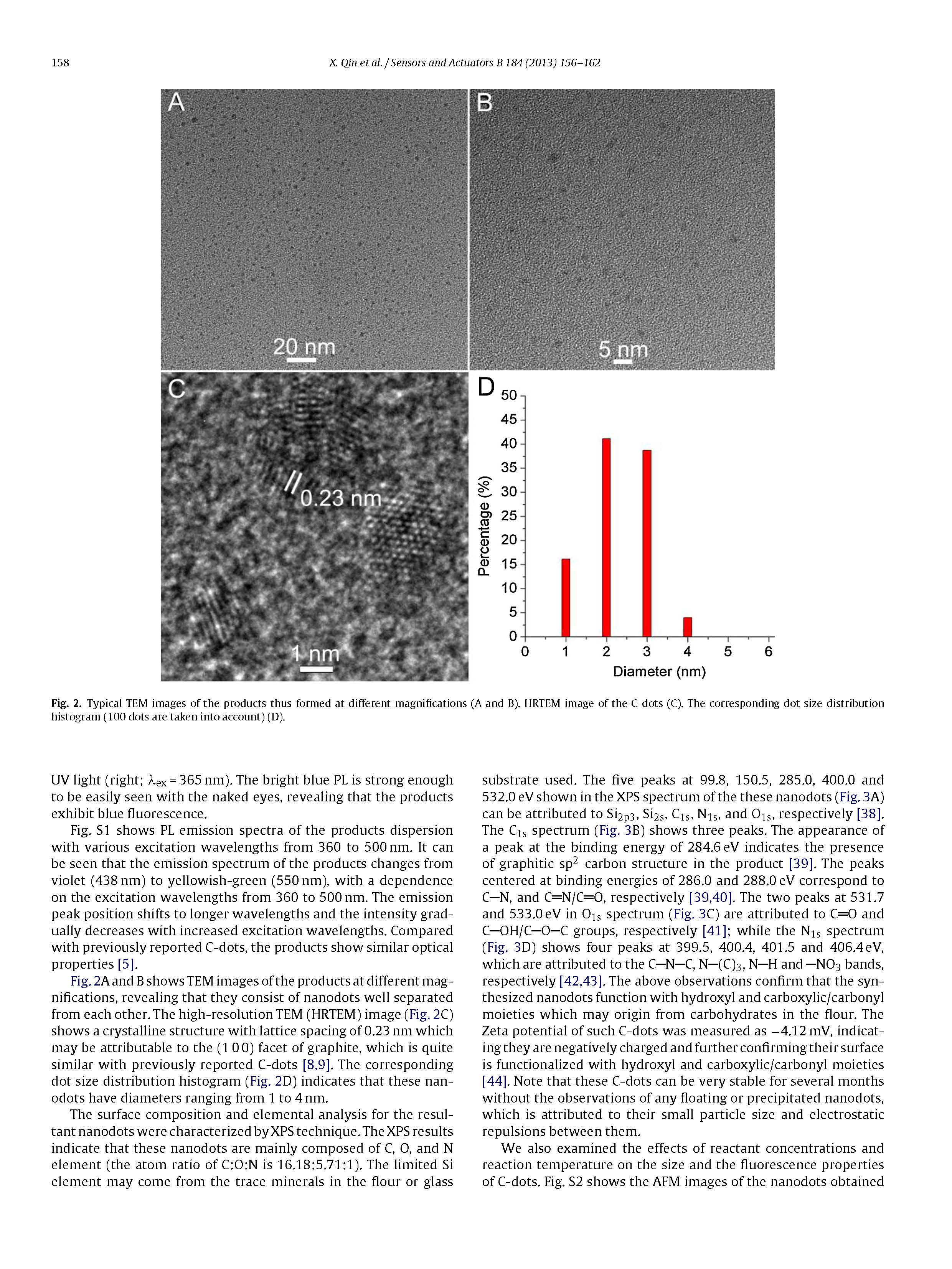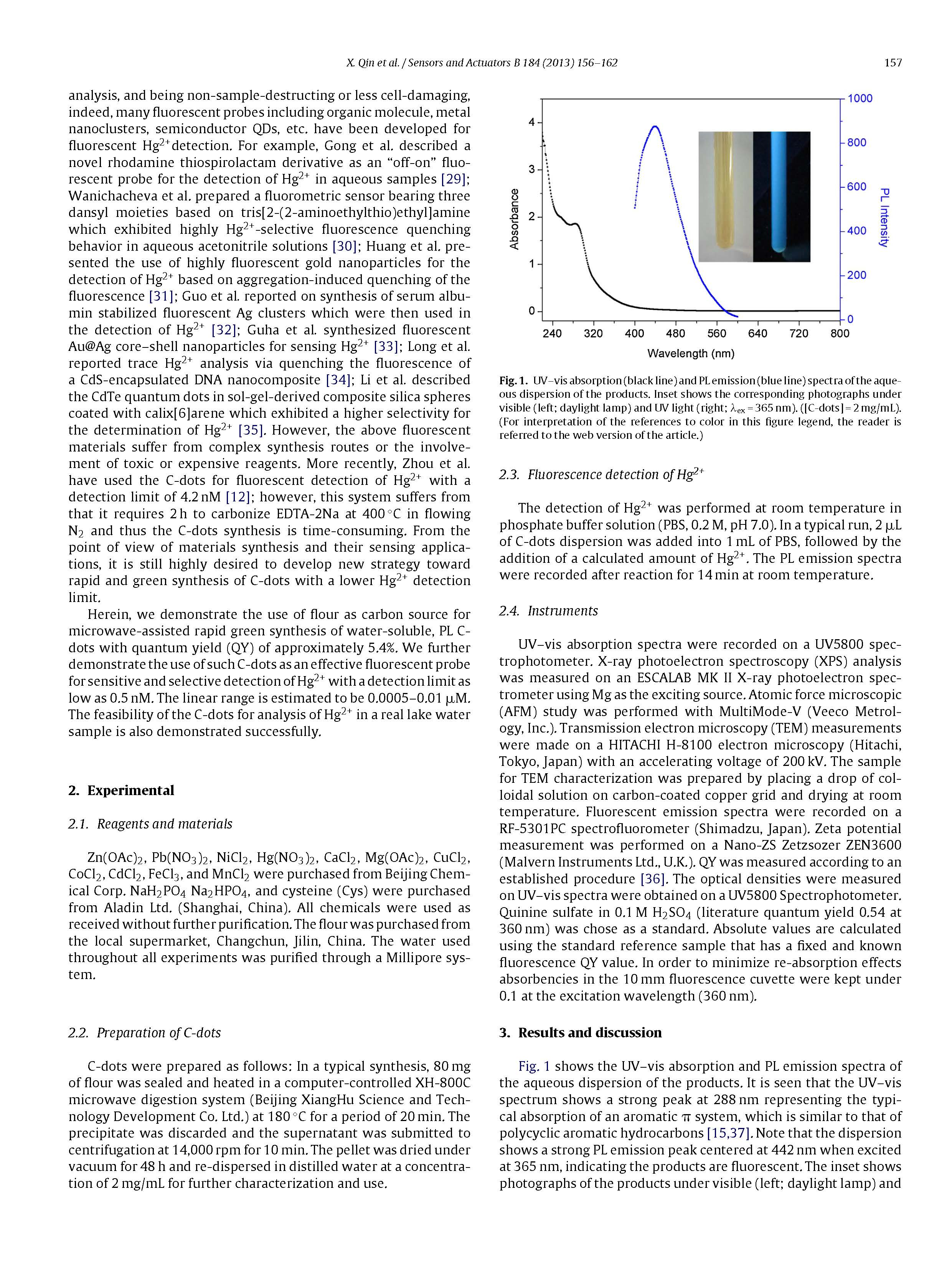 綜上所述,微波輻照面粉水分散體是一種快速綠色合成C點的簡便方法。該C點可作為一種靈敏、選擇性檢測Hg2的有效熒光傳感探針,檢出限低至0.5nm。我們的觀測很重要,因為它為我們提供了一條快速、低成本的途徑,用于綠色生產用于傳感、生物成像和光學成像及其他應用的C點。