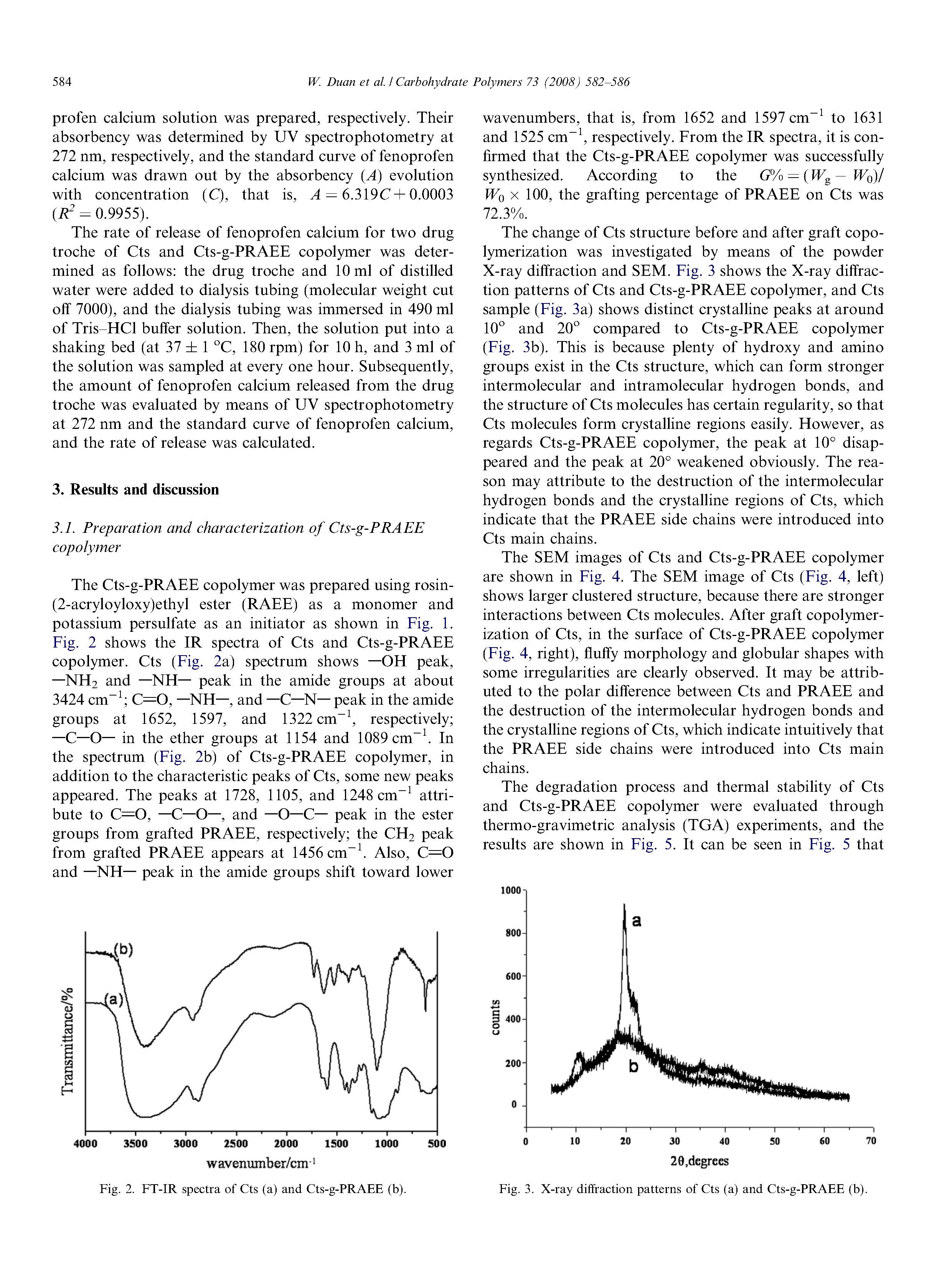 同時,以CTS和CTS-g-PRAEE共聚物作為非諾洛芬鈣(FC)的載體,研究了它們在人工腸液中的控釋行為。