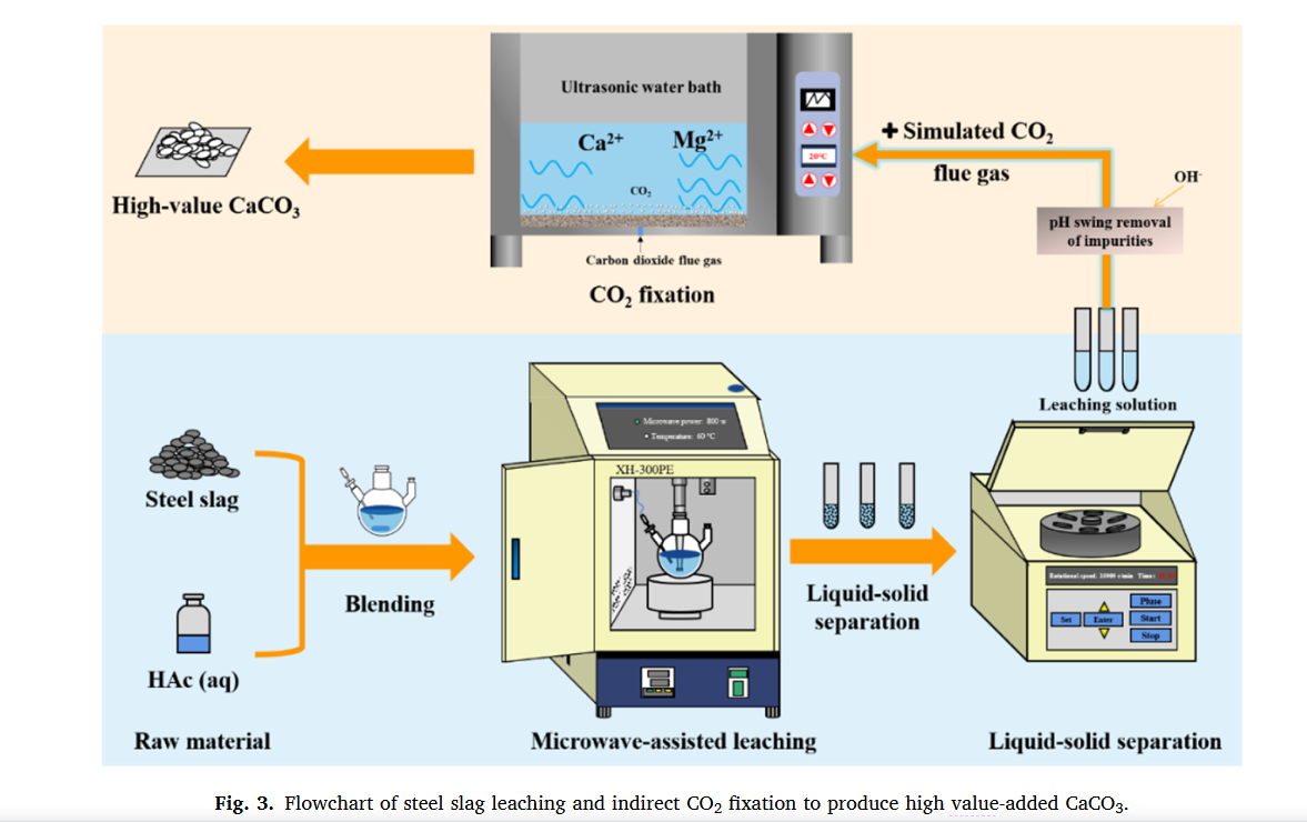 在這篇手稿中,我們介紹了一種使用乙酸 (HAc) 作為浸出溶劑的鋼渣碳化技術(shù)。此外,我們深入研究了不同實驗參數(shù)對微波環(huán)境下鋼渣浸出過程的影響。它揭示了鋼渣中的鈣浸出動力學(xué)機制,并通過吸附滲濾液中的低濃度 CO 合成高價值的 CaCO產(chǎn)物。該工藝將 HAc 的選擇性浸出能力與微波增強加熱提供的均勻性和效率相結(jié)合。因此,鈣和鎂元素被選擇性地分離并從鋼渣中浸出。它解決了鋼渣性質(zhì)不穩(wěn)定和資源利用受限等挑戰(zhàn),展示了廣闊的發(fā)展前景。此外提取的溶液可用于 COsequestation 和高純度、高價值碳酸鹽材料的合成。這極大地促進(jìn)了鋼鐵行業(yè) CCUS 技術(shù)的進(jìn)步,同時產(chǎn)生了巨大的社會和經(jīng)濟優(yōu)勢。
